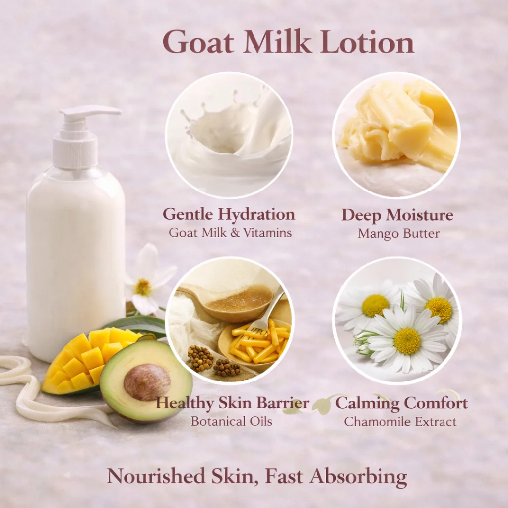 Scent is just the beginning — what truly sets our lotion apart is its carefully crafted formula. At the heart of every bottle is fresh goat milk, packed with skin-loving vitamins and known for its gentle, pH-balanced hydration. Goat milk moisturizes without irritating, making it ideal for sensitive, dry, or mature skin.
